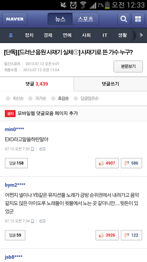 저 베댓일위 댓글의 댓글보면 엑소 팬들이 사재기 아니라고 댓글써놨는데 다른 사람들은 쉴드 안치면 반만 간다 이지랄해놈ㅋㅋ 지들은 증거도 없는데 엑소를 사재기 가수로 몰고가면서 진짜;; 엑소 음방일위 조작했단 말들으면 조작했을 가능성이 없잖아 있어서 쉴드 안치고 가만히 있었는데 저건 진짜 개화난다 어떻게 멜론같은 음악사이트 일위한적도 없고 20권 안에 든적도 없는 가수를 사재기라고 몰고 갈수있냐 진짜;; 저 추천누른 몇천명도 노답이다 진심 다 뒤졌으면 좋겠음
