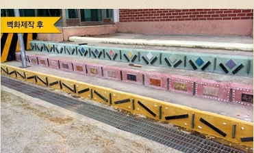 기와 등의 조각을 담장에 붙여 제작하는 친환경적인 벽화제작을 선택했다고 해요..