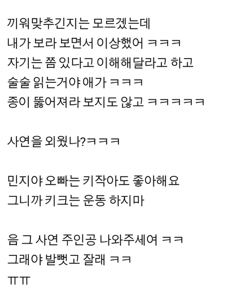 사연읽는거 였는데 민지사연? 자기는 키가작은데 어쩌구저쩌구~그니깐 크리스가 민지야 오빠는 키작아도좋아?이런식으로 말했잖아ㅋㅋ