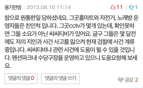 cctv를 가져와라, 다른 서에 신고를 해라 조언해주시는 분들도 많은데 cctv는 펜션의 소유이기때문에 경찰이 아닌 이상 가서 요구할수없습니다.