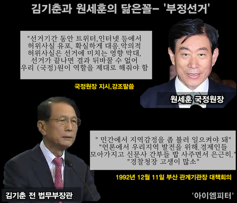 원세훈이 국정원 직원의 신분을 노출하지 않고 개인자격 운운하며 댓글 작업을 했던 일과 동일한 부정선거 방법이었다는 사실은 김기춘과 원세훈이 시대만 달랐지, 똑같은 수법으로 부정선거를 자행했다는 증거입니다.