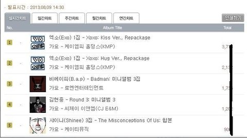 그러다가 네시 반차트임 비에이피가 일위임 두시간만에 1700장에서6800장대임ㅋㅋㅋㅋㅋㅋㅋㅋㅋㅋㅋㅋㅋ여기부터 좀 의심이 되긴함 동방신기도 두시간만에 저정도로 팔지는 못할꺼임 그리고 엑소는초동 1위인데 저정도로 못함 엑소고 같이 비교가 되고 있잖슴??? 어쨌든 다음으로 넘어가면ㅋㅋㅋㅋㅋㅋㅋㅋㅋ