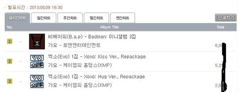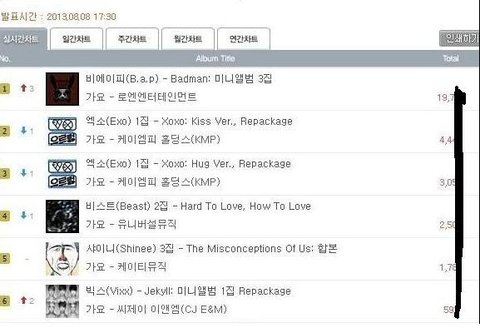 먼저 오늘두시에 한터 온라인 판매량 차트임 엑소가 일위임(아마 한국어중국어버전일꺼임) 그리고 비에이피 판매량은 1700장대임(여기는 밝힐수 X 한터는 돈주고이용하는 서비스라서임) 사실은 1700장대도 많이 판거임 첫날이니깐 ㅇㅇ