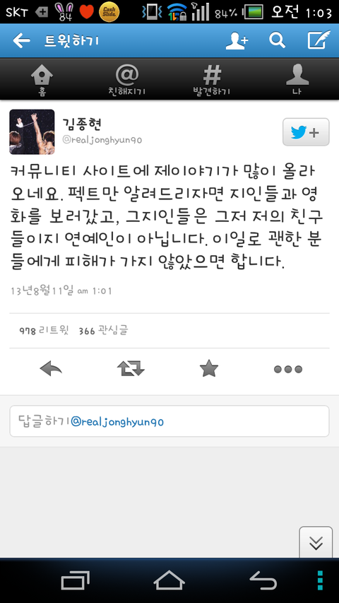 저거 종현오빠 친구에요 연예인 아니고요;잘알지도 못하시면서 종현오빠를 욕하시거나 뭐라하시는건 아닌거 같아요 또한 비하하는 말도 안되고요 분명히 말하지만 저거 경리 아니고요 종현오빠 사적인 친구입니다^_^다른 분들 오해 안하셧으면 좋겟네요 빠순이가 연예인 감싸신다고 말하셔도 좋은데요 진실우만을 알고 넘어 가셧으면 좋겟네요