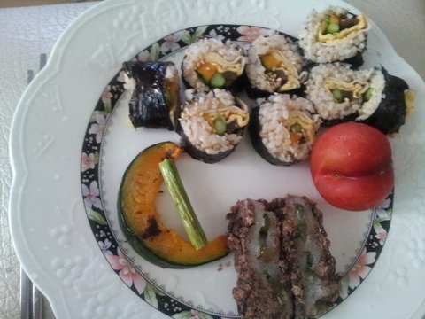 갑자기 김밥이 먹고싶어서 김에 현미밥에 아스파라거스랑 우엉이랑 아이 맛있어. 그 옆에 떡은.. 마이쪙!