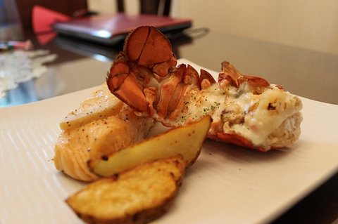 정말 정성이 가득한 요리 입니다. 아주 조금 아쉽다면, 스테이크나 스파게티 요리위에 올리는 데코용 야채들은 잎사귀 세개를 초과 하지 마시기 바랍니다. 오히려 메인 요리를 감추는 부작용이 있답니다.장식용 야채는 절대 많이 얹지 마세요. 그냥 포인트만 주는거랍니다. 그리고, 마늘도 여기저기 원을 그리듯 놓으셨는데, 스테이크 바로옆에 한데 모아주시는게 오히려 더 보기 좋습니다. 자칫 지저분해 보인답니다. 그리고 랍스터는 살 밑바닥 까지 완전히 칼로 칼집을 내주시고, 여섯에서 8조각 정도 칼집을 내시면 양념도 잘 배어들고, 먹기도 편하답니다. 참 잘하셨어요