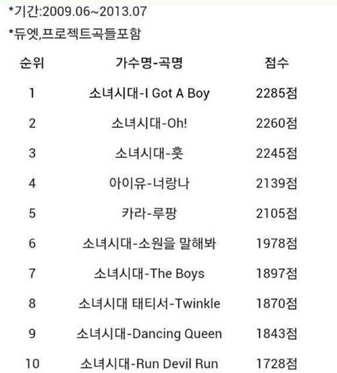 와...소녀시대 진짜 대단한듯.....근대 여자솔로가수중에 유일하게 4위한 아이유도 참 대단한듯...