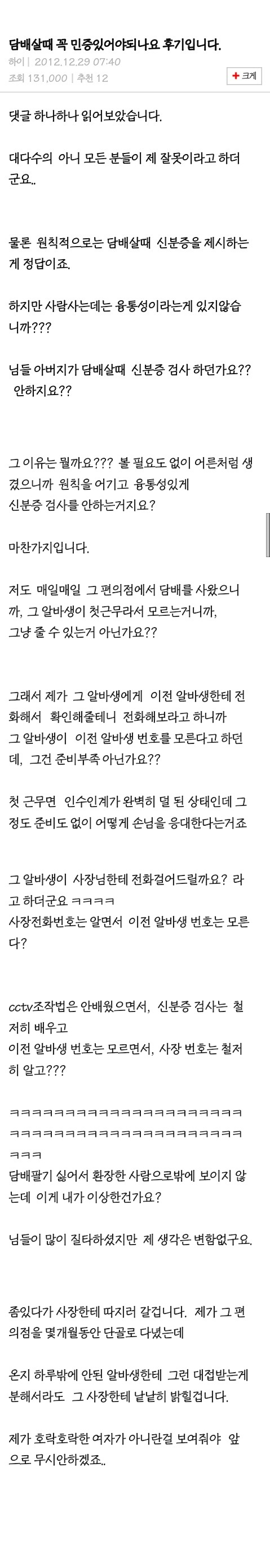 그 알바생 입장도 생각해야지 만약에 그런 식으로 담배 팔다가 미성년자면 벌금 많이 내는데??? ------------------------------------------------------------------------------------ 내 첫 베플 ♡ ㅋㅋ 감사합니다 ㅋㅋㅋㅋ