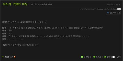여자 : 그 위대한 남자들을 다 여자가 낳았어 ㅇㅋ? 너넨 여자없이 태어나지도 못하잖아 ㅋㅋㅋㅋ
