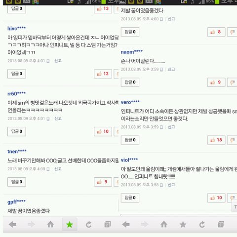 사진 보이시죠? 기사 댓글입니다. 인스피릿분들, sm 엄청나게 까더라구요? 에스엠 팬분들 기분 생각안하시나요? 기분 나쁠수도 있어요. 인피니트 본연의 색을 잃을수도있다고 생각하면- 이해하는데요. 근데 이건 아니죠. 인피니트에게 팬이 있듯이 SM팬분들도 엄청나요. 다시말해요? 대한민국 케이팝을 이끌어가는 슈퍼주니어,동방신기,소녀시대,보아,에프엑스,엑소,샤이니 등이 모두 SM이에요. 팬수만 엄청나겠죠. 근데 지금 이런 sm을 까도 되는거에요? 무슨자신감으로요? sm의 가수 한그룹만 뽑아도 인피니트보다 훨씬 팬 많을걸요. 개스엠,에쓰엠더럽다,에쓰엠싫다. 이런글 엄청많이봤어요. 뭐하시는거에요, 대체. 만약 울림보다 작은 회사가 울림과 합병을 하는데 그 회사 팬들이 울림을 아주 개처럼 까면 기분좋겠어요? 똑같은 거잖아요. 왜 당신들 생각만 해요? 왜 당신들 기분나쁜것만 생각하냐구요- 왜이렇게 이기적이에요? 인스피릿 원래 이렇게 이기적이었어요? 진짜 요즘은요 버스를 타거나 지하철을 타고 인스피릿 무개념이라는 소리가 들려오더라구요. 그럴때마다 솔직히 말해서 창피하거든요- 인피니트를 좋아하는건 자랑스럽고 행복하지만 인스피릿이 무개념 짓할때마다 인스피릿이란게 창피하고 부끄럽다구요. 왜그런기분을 당신들 때문에 느껴야하는데요? 왜저희가 무개념인스피릿이 질러놓은 짓에 대해 사과를 해야하는데요. 그리고 인피니트는 무슨 죄로 욕을먹는건데요. 당신들이 싸질러놓은 똥때문에 제일많이듣는소리. "인피니트는 괜찮은데 무개념들때문에 인피니트가 싫어진다.","인피니트 불쌍하다. 왜저런 팬들을 둬가지고욕먹는지-","인피니트그저그랬는데인스피릿때문에 짜증나지려함." …. 솔직히 아시죠? 더 심한욕 많이듣는거- 왜 인피니트가 당신들때문에 상처받아야하는데요. 그리고 왜 특히 카스나 트윗에서 왜이렇게 무개념들이 많죠? 본인들은 무개념이라고 의식못하는거같은데. 자신과 관련없는 타가수를 까는거 그것만해도 무개념아닌가요? 음악방송에서 인피니트가 1위후본데 1위를 못하면, 그 1위 하신 분들 엄청까시더라구요. 뭐하는거에요, 대체? 그분들이 무슨 죈데요. 열심히 일해서 결국 1위했는데 잘못한거에요? 진짜 한심해요. 인피니트만 1위해야하고 다른가수들은 열심히일했든 피땀흘렸든 그냥 자기알빠아니란거네요. 이기적인것들아^^. 말심해서죄송해요. 근데진짜 좀 아닌것같아요. 인스피릿. 제발 정신좀 차려요.