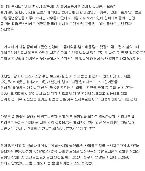 이건또뭐죠. 인스피릿,진짜할말이안나오네요.ㅎㅎ..예의라는걸모르나?뭐 기본 상식같은거 몰라요? 공공장소잖아요. 이럴수록 우리가 더 욕먹고 우리 이미지만 나빠져요. 인피니트 좋은거알아요. 인피니트 많이 좋아해줘서 감사한데요, 이런식으로 좋아하면 무슨소용인데요. 제발, 사생들이나 무개념. 자제해요. 사생도 그래요. 가수들이 제일싫어하는 팬들이 사생팬이에요. 콘서트를 가거나 공방을 뛰거나, 팬싸를 가세요. 꼭 숙소주변에 숨어들어서 쥐새끼처럼 자기 가수 몰래봐야해요? 그게 재밌어요? 즐거워요행복해요? 가수들은 얼마나 죽을맛인데요- 자신의 일거수일투족을 누군가가 감시한다고생각해봐요. 그게 감시가아니면 뭔데요? 아예 숙소앞에 텐트치고 돗자리깔고 드러눕더라구요? 자기집인마냥. 그러다 자기가수가 숙소에서 나오거나, 스케줄 끝마치고 숙소로 돌아오면 아주 개처럼 달려들죠? 그러지좀 마요. 제발요. 팬분들, 아니 인스피릿분들. 우리 정신차립시다. 무개념 행동 그만하고 개념팬으로 등극해요. 네? 우리 무개념 아니잖아요. 언제까지 무개념이라는 타이틀 달고살거에요. 우리, 말하기전에 한번더 생각해보고, 그리고 올려요. 그리고 타가수, 타팬덤 까지말자구요. 예를 들면 무한도전에 성규 나왔는데 방송분량이없다고 까거나, 저번 런닝맨에 엘 나왔는데 방송분량없다고 까거나. 그때정말창피했어요. 정말그러지좀말죠. 우리는 그런 유명하고 대단한 프로그램에 나왔다는것만으로도 감사해야해요. 방송분량 따질수가 없다구요. 알았죠? 우리 개념팬 되도록 다같이 노력해요. 긴 글 읽어주셔서 감사합니다. 중간중간 심한말이있었다면 진심으로 사죄드려요,죄송합니다. 그리고 인피니트를 포함한 모든 가수 흥했으면 좋겠구요. 팬덤문화가 조금더 깨끗해졌으면 좋겠다는 마음으로 끄적여봤습니다. 네이트판 잘 보지도 않고, 게다가 처음 작성해보는 톡이라 다소 어색하더라도 이해해주세요. 다시한번 긴글읽어주셔서 감사합니다.