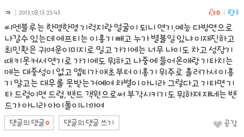 보신분도 있으실지 모르겠는데 에프티 관련글에 댓글다신분들중에 씨엔블루랑 비교질하시면서 에프티는 키가 어떻다느니 나이가 어떻고 대중성이 어떻고... 하시는데 한성호대표님이신줄 알았네요.