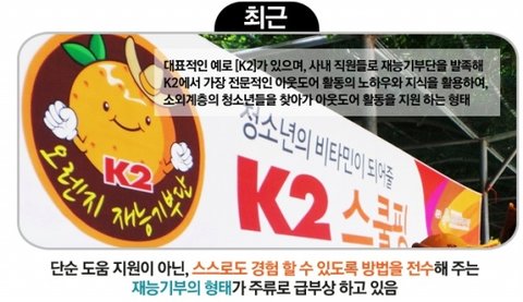 최근 기업들의 CSR 형태로 가장 대표적인 사례는,,, 위에서도 언급한 'K2의 스쿨핑'이라고 할수 있습니다