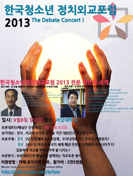 안녕하세요? 한국청소년정치외교포럼에서 이번에 새로이 개최하는 한국청소년정치외교포럼 2013 : The Debate Concert(약칭 포럼2013) 에 여러분을 초대합니다. 포럼2013은 기존의 청소년 단체의 행사들과는 달리 정치와 외교 분야의 전문가분들 과 함께 선발된 토론대표단들이 정치, 외교 분야로 나뉘어서 각자의 찬반의견에 대한 입론 강연부터 시작하여 청중패널단들과 함께 토론을 진행하는 형식으로 진행 될 예정입니다. 또한 이후에 전문가분들께서 토론에 대한 짧은 코멘트와 강연을 듣고 청중 분들이 토론하고 질의응답 하는 쌍방향씩의 신개념 포럼입니다. 이번에 새로이 개최되는 최고의 기회, 최고의 스펙이 될 포럼 2013에 정치 혹은 외교에 관심이 많은 청소년들을 청소년 강연자로써 혹은 청중 토론자로써 초대합니다!