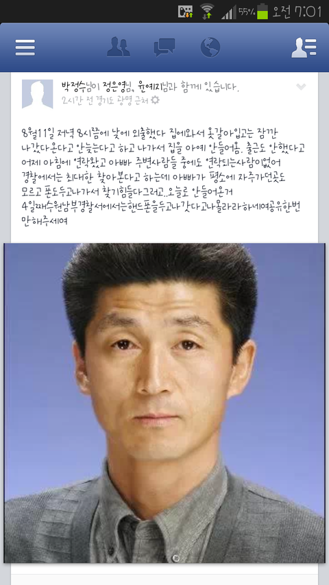 8월11일 일요일 낮에 외출하셨다 돌아오셔서 옷을 갈아입으신후 저녁8시쯤에 잠깐 나갔다온단 말을 남기시고 나가셔서 소식이 끈겼어요