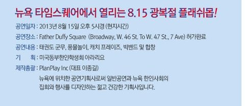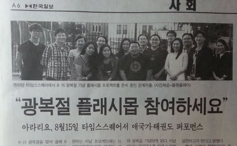 그러하다. 스파이더맨이 날라다니는 그 곳, 어벤져스가 뭉치는 그 곳, 뉴욕 타임스퀘어! 바로 그곳에서 오늘 광.복.절 플래쉬몹이 펼쳐집니다!! 몇 백, 몇 천의 외국인들이 지나다니는 이 광장에서 약 200명에 달하는 한인들이 플래쉬몹을 펼치는 것을 상상해보세요. 태권도군무, 풍물놀이, 빅밴드, 대규모 아리랑합창등으로 퀄리티 높은 대한민국 문화홍보를 한다면 그 외국인들에게 미치는 영향은 실로 엄청날 것입니다!