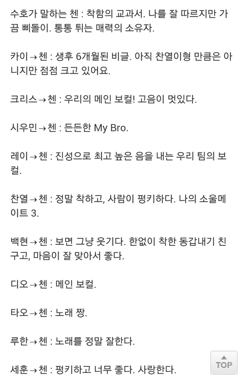 아 또 최근에 인터뷰에서 멤버들이 말하는 누구! 이런식으로 한게 있었는데 정말 지금 왕따설 거론되는 첸이나 레이가 제일 좋게 적어져 있음 따로 설명안하겠음