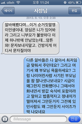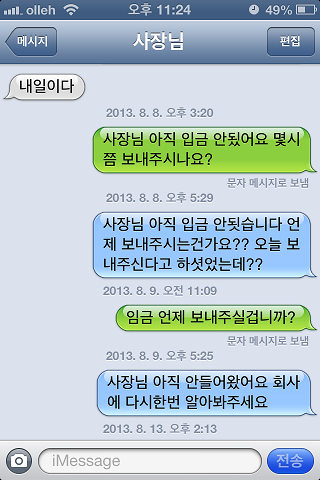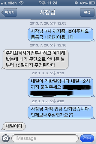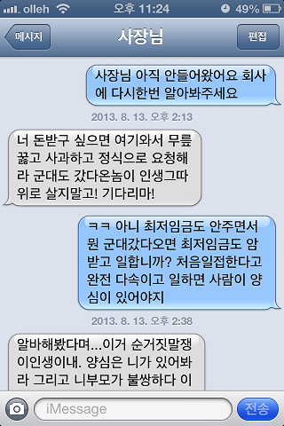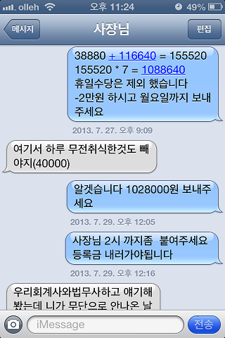결국 노동청에 신고해서 나중에 전화가니까 ㅋㅋ 문자가 이렇게온다