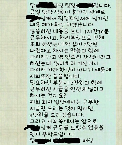 8월 14일 과자같은 Jxxxx에서 일일 알바를 받고일을 하러갔습니다 사무집기 운반하는 일이었습니다한시간 좀 넘게 일하던 중 서랍을 들다가 삐끗한건지 허리가 끊어질듯 아픈 통증을 느끼고 잠시 주저앉았다가일어서서 겨우 버티다버티다 못버티겠어서Jxxxx 담당자에게 문의했더니 자신들 스텝에게괜찮냐는 물음도 없이 근무시간이 너무 짧아 급여지급은 안되고사무집기운반측 담당자에게 말을 하고 가랍니다너무 화가나고 아파서 제가 그럼 다치러 왔냐고 물었더니한시간 반정도의 급여를 줄테니 가라는 말에 끊고집으로 돌아와 정형외과에서 물리치료를 받았습니다그날 하루는 생각하기도 싫을만큼 아팠고 탈진할뻔했습니다