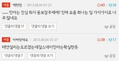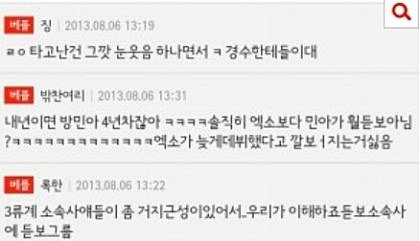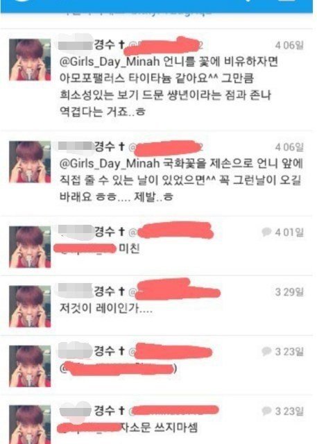 근데 민아가 애교하는게 진짜 안어울리고 하면 모르겠는데 내가 볼땐 귀여웠음.^0^니네 오빠들이 방송에서 애교부리면 좋다고 움짤만들고 카톡프사 해놓고 공유하고 그러면서왜 민아가 하면 그렇게 욕먹는거야?오빠들이 그룹띄울려고 그렇게 애교부렸다고 하면 안쓰럽다 미안하다 이러면서왜 민아가 하면 그렇게 욕하는거냐고