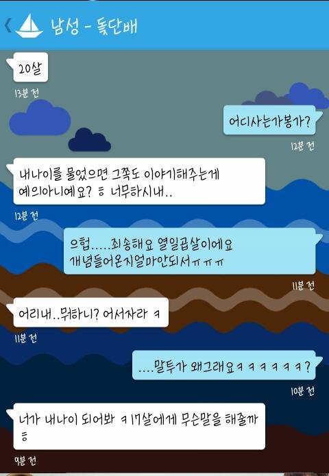 그래서 첫 보내기? 그걸 안녕하세요ㅎㅎ 라고보냇어요 그니깐 아네..ㅋㅋ 이러길래 할말이 없는거에요; 그래서 몇살이세요? 이러니깐 스무살이래요