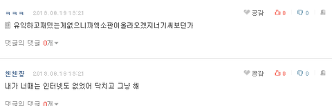 ㅋㅋㅋㅋㅋㅋㅋ순수하게 재밌고 유익한 글 써달라는 애가 무슨 잘못임? 이러니까 니네가 욕 먹는 거야 맞는 말이잖아 니네가 유익하고 재밌는 게 없는 거지 딴 분들이 쓴 좋은 글들 묻히지 않게만 해주면 안 되냐?ㅋㅋㅋㅋ