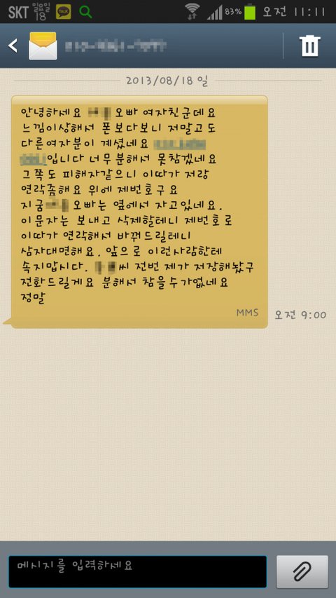 잠이 덜 깬 상태에서 한쪽 눈으로 메시지를 본 거라서 잘못 본거라고 생각했는데 정신이 번쩍 들면서 다시 보니 저와 동시에 만나고 있던 그 여자에게서 온 문자였습니다.