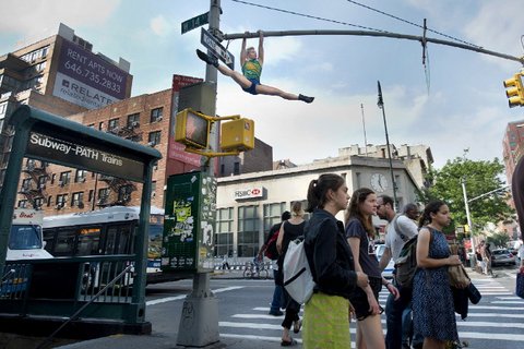 횡단보도를 날아가듯 건너는 행인, 공연이 끝난 후 대수건와 함께 뛰어오른 청소부 등