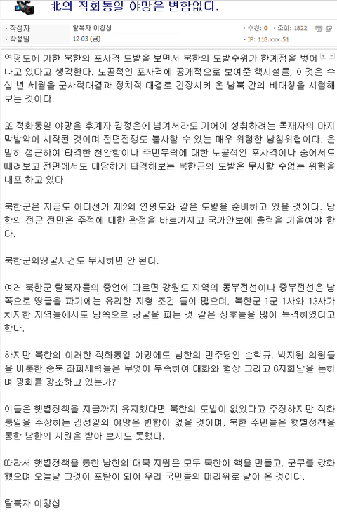그들의 평화는 거짓 평화이며 결국 북한을 돕는것은 우리에게 미사일이 되어 날라올것이라고 조언까지
