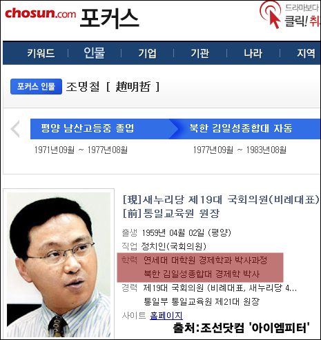 문제는 조명철은 그때부터 박사출신 1호 탈북자와 김일성종합대학 교수라는 학력과 경력을 통해 한국에서 승승장구하며 국회의원까지 됐다는 사실입니다.
