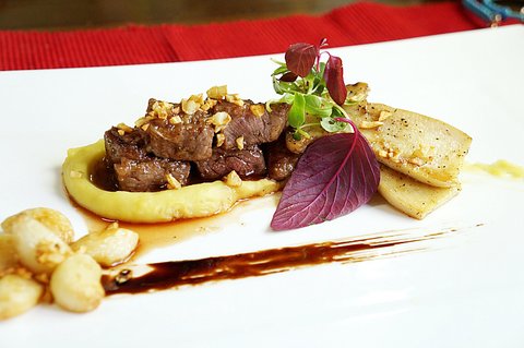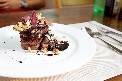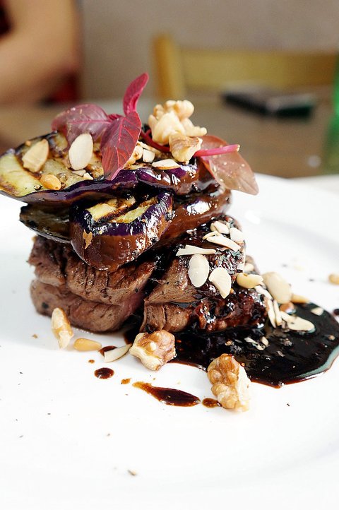 요리 이름: 블렉페퍼 소스의 안심스테이크와 그릴링한 가지, 견과류