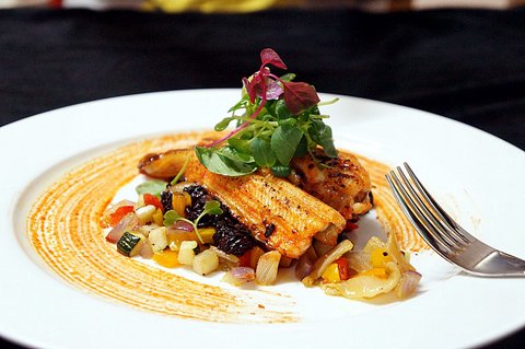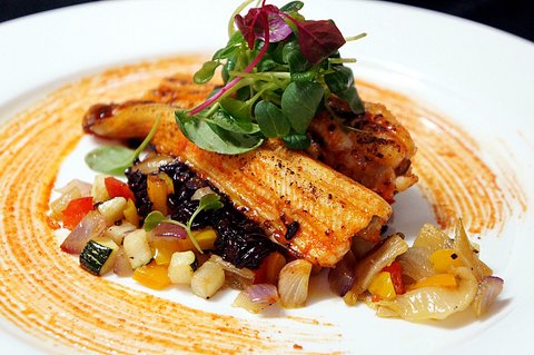 요리 이름: 살구 고추장 소스의 장어구이와 김치 라따뚜이를 곁들인 흑미