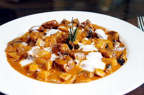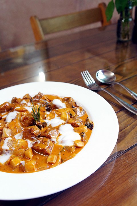 소고기에 밀가루와 파프리카 가루를 넣고 볶아 , 토마토 소스나 생크림을 넣어 끓여주고