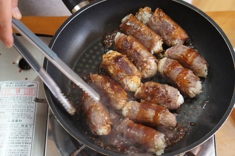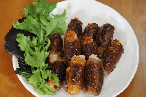 채끝살을 밥에 싸서 돌돌 말아서 데리야키 소스로 구운요리지요.