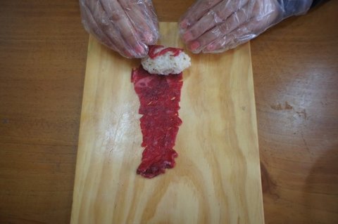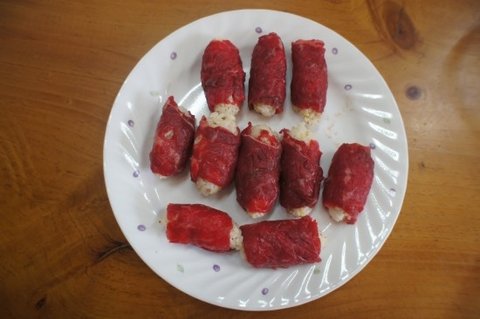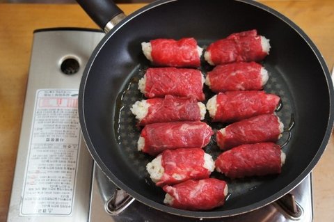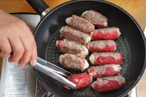 3.밥을 작은 주먹밥 크기로 준비한 후 고기에 돌돌 말아서 준비 합니다.