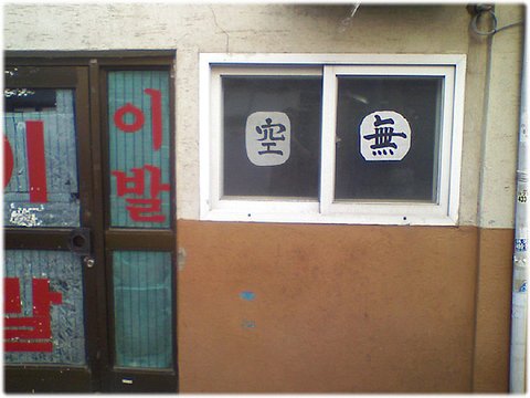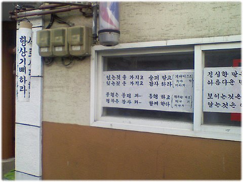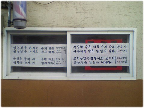 재미있는 건, 이발소 바깥 유리창에 주인이 직접 쓴 붓글씨가 가득 붙어 있다는 점이다.