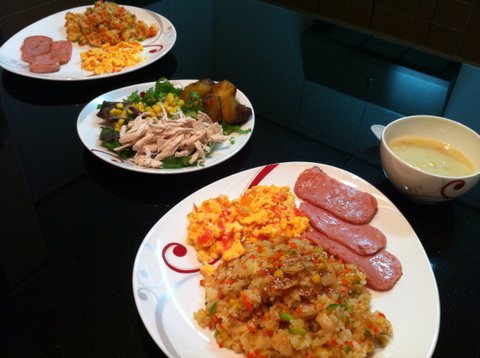 야채볶음밥, 스팸구이, 토마토오믈렛,닭가슴살 샐러드, 콘스프, 고구마맛탕은 엄마표 ㅋㅋㅋ