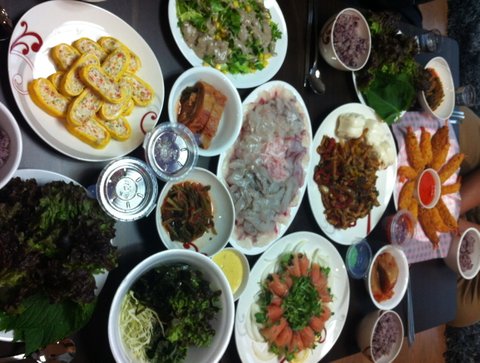 해물탕+굴전+월남쌈+꽃빵&고추잡채+닭찜+그외 밑반찬..