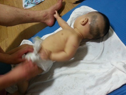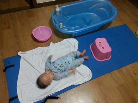 목욕후 재빨리 로션을 바르고 기저귀를 채웁니다..