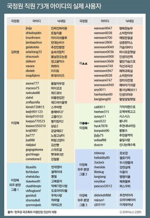 진 의원의 주장에 의하면 김하영씨는 닉네임 jinjia(진짜진짜라묜), ariarirang33(숲속의 참치) 등 11개의 아이디를, 국정원 직원 이씨는 wanwan0047(행복한 농부) 등 16개의 아이디를, 민간인 이정복씨는 cometome2(강철봉) 등 37개 아이디를 사용한 것으로 밝혀졌다.