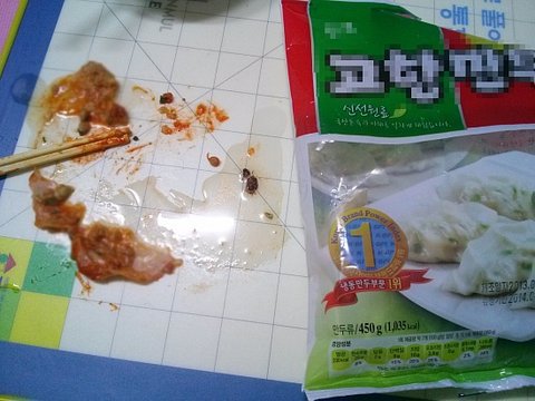 저게 김치만두가 아니라 그때 떡볶이랑 같이 먹고 있어서 저렇게 붉으스름한 이물질이 된거임;;;