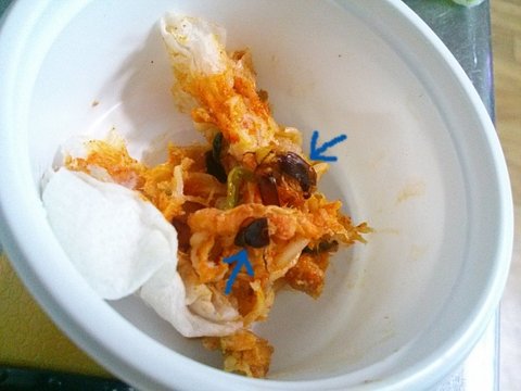 바삭소리가 나며 씹자마자 바로 뱉어내고 "이게 뭐야?!!" 하면서 벌레를 골라낸거임