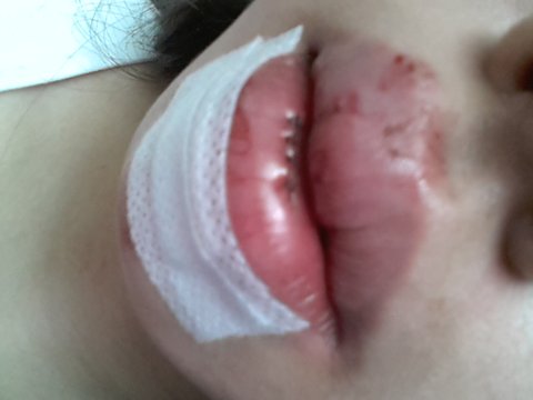 입술과 턱쪽 몇바늘인지는모르겠지만 꼬맸어요.