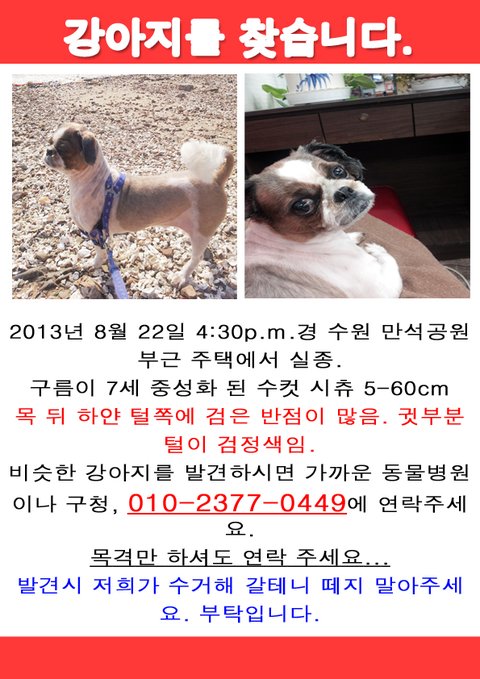 혹시 수원에서 비슷한 강아지라도 보신 분은 전화해주시거나 구청에 신고해주세요..