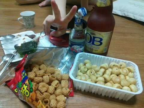 첫날 야식으로는 제주도니까 한라산 소주와 맥주, 그리고 과자들입니다~