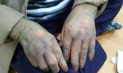» 지난 달 29일 새벽 철거 용역들로부터 당한 폭행으로 부어오른 배아무개(75) 할머니의 두 손. 허재현 기자