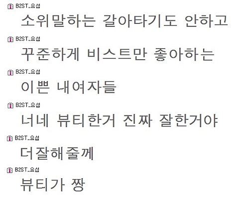 너무 좋아요 너무 자랑스럼고 정말 제가제자신이 뷰티인게 너무나 자랑스럽습니다 요새 비스트 햄버거 500개쏜 이벤트떄문에판에서도 자주보게되고 너무 기분이좋네요 그래서 항상 일위못시켜줘서 너무 안타깝네요 팬이여서 자랑스러운 아이돌 비스트 너무 자랑스럼습니다!!!!