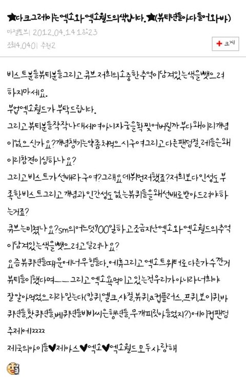 색상..변경해주세요. 그리고 소속사 규모가크다고 이런팬들 방관한다면 그건 규모가 큰 소속사가 본인의 책임과 의무를 다 하지 않고 있다는 증거겠죠?