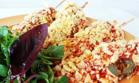 양념먼저 듬뿍 발라주고 콘칩튀김옷에 굴려 손으로 조금 눌러 붙여주면 치킨살에 양념소스에