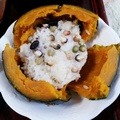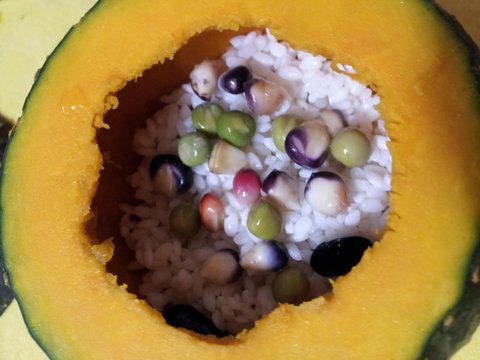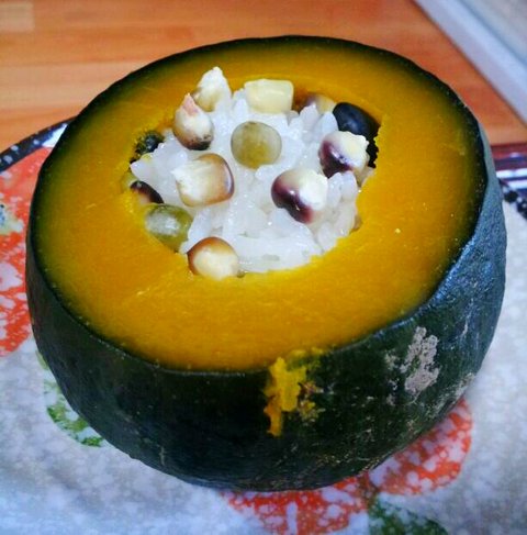이렇게 먹음직스런 단호박영양밥이 완성될려면 찜솥에서 40분정도 쪄야되는데 단호박 뚜껑은 닫지않고 솥뚜껑만 닫고 찌면됩니다..단호박 뚜껑을 닫으면 밥은 안되고 단호박만 익어요..그럼 생쌀을 먹게되죠ㅋㅋ